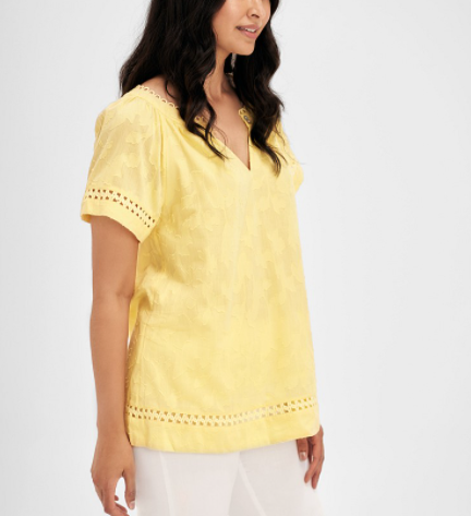 Wear this top from Blue Illusion with these white pants and sandals that are very similar. This summery new marigold color top is made of 100% cotton and features a loop trim detail at the neckline for a pretty, feminine look. This sunny top features a floral jacquard pattern and lace edging for a beachy vibe. Click here to shop Blue Illusion’s Jacquard Cotton Top.